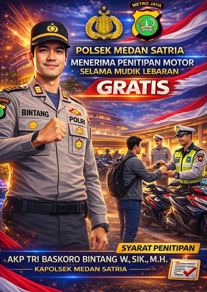 Bekasi — Dalam rangka memberikan rasa aman dan nyaman kepada masyarakat yang akan melaksanakan mudik Lebaran, Polsek Medan Satria membuka layanan penitipan kendaraan roda dua secara gratis bagi warga. Program ini bertujuan untuk mencegah tindak kriminalitas, khususnya pencurian kendaraan bermotor, saat rumah ditinggalkan pemiliknya selama periode mudik.