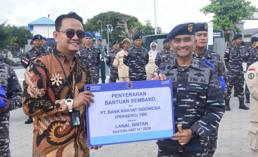 TNI AL, Bintan- Komandan Pangkalan TNI Angkatan Laut (Danlanal) Bintan Letkol Laut (P) Wityuda Timortimur Suratmono, M.P.M., didampingi Ketua Cabang 5 Kodaeral IV Ny. Agustin Wityuda, serta Kepala BRI KCP Tanjung Uban Muhammad Irfan, dan para Perwira Staf Lanal Bintan, melaksanakan pembagian paket sembako kepada seluruh Prajurit dan PNS di Lapangan Apel Mako Lanal Bintan, Jumat (13/03/2026).