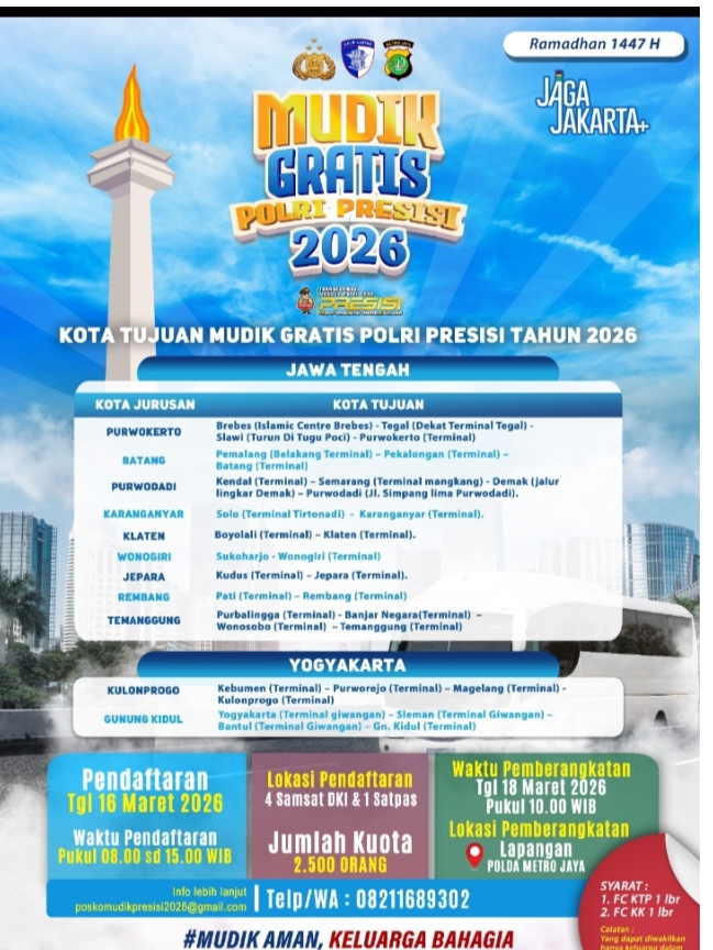 Jakarta -Menjelang hari raya Idul Fitri 1447 H, Polri kembali menghadirkan program “Mudik Gratis Polri Presisi 2026” bagi masyarakat yang ingin merayakan lebaran di kampung halaman. Program bertajuk #MudikAmanKeluargaBahagia ini menyediakan kuota sebanyak 2.500 orang dengan berbagai kota tujuan di Jawa Tengah dan Yogyakarta. Pendaftaran secara resmi dibuka pada Senin, 16 Maret 2026, mulai pukul 08.00 hingga 15.00 WIB, untuk memberikan kesempatan bagi warga mendapatkan fasilitas perjalanan yang aman dan nyaman.Menjelang hari raya Idul Fitri 1447 H, Polri kembali menghadirkan program “Mudik Gratis Polri Presisi 2026” bagi masyarakat yang ingin merayakan lebaran di kampung halaman.